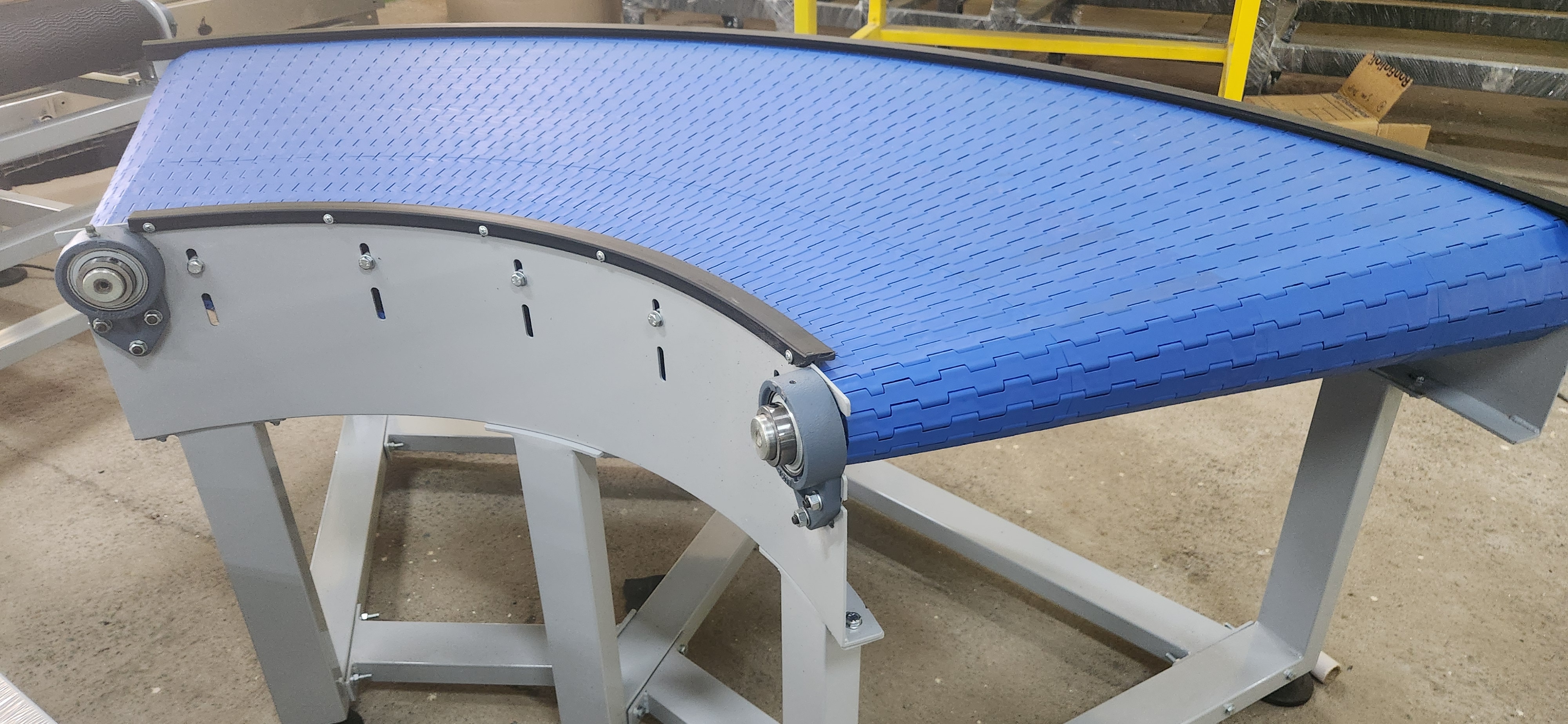 Modular 90° Conveyor is a curved conveyor system designed to change the direction of product flow by 90 degrees without manual handling. It uses interlocking modular plastic belts that provide smooth and stable product movement around curves in industrial production or packaging lines. Key Features 90° Direction Change: Efficiently redirects products in limited floor space. Modular Plastic Belt: Durable, flexible, and easy to replace sections if damaged. Smooth Product Transfer: Prevents product slipping or falling during turning. Low Maintenance: Modular design allows quick cleaning and part replacement. Customizable Design: Available in different widths, radii, and frame materials (MS or SS). Applications Food processing industries Packaging and bottling plants Warehouses and logistics centers Pharmaceutical production lines Assembly and inspection lines Advantages Optimizes factory floor space utilization Ensures continuous material flow in production lines Handles light to medium load products efficiently Suitable for wet, dry, or hygienic environments